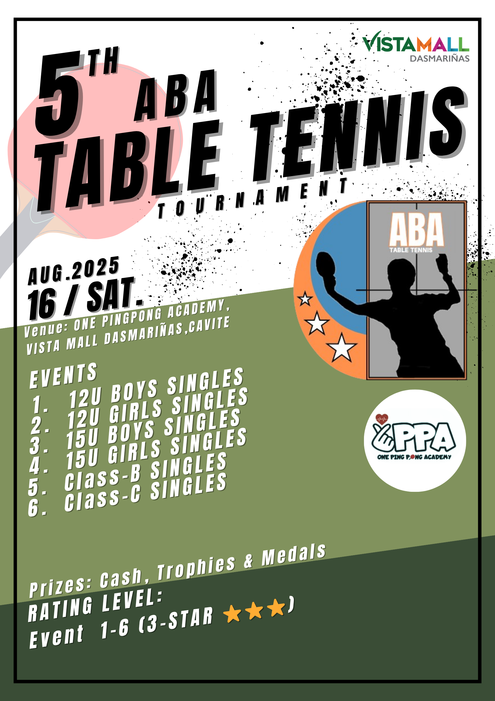 The 5th ABA Table Tennis Age Group Tournament will take place on Saturday, August 16, at One Pingpong Academy, Vista Mall Dasmariñas, Cavite. The competition features 3-star rated events for various categories including 12U and 15U boys and girls singles, as well as men’s and women’s singles. Hosted by ABA Table Tennis in partnership with One Ping Pong Academy (OPPA).